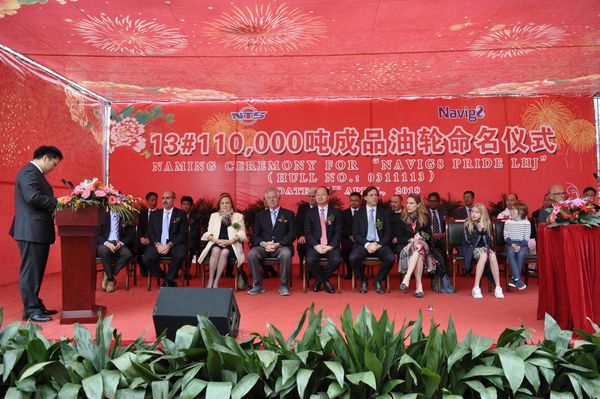 On April 13, the naming ceremony of No.13 111,000 DWT Oil Tanker was held ceremoniously in our shipyard and the vessel was named as "VAVIG8 PRIDE LHJ". Executive Vice President Mr. Zhang Yuyong conducted this ceremony, our CEO Mr. Liu Haijin and representatives from the Class and the Shipowner attended this ceremony.