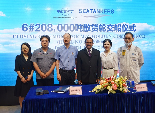 On June 10, 2020, the closing ceremony for 6# 208,000 DWT Bulk Carrier was held at the meeting room on 8th floor of New Times Office Building. Our CEO Mr.Liu Haijin, Executive General Manger Mr. Zhang Yuyong, the representive from SEATANKERS Mr. A.C. Caeiro, and the representative from LR Mr.Kim attended this ceremony. The vessel was smoothly and successfully delivered by us and accepted by SEATANKERS.