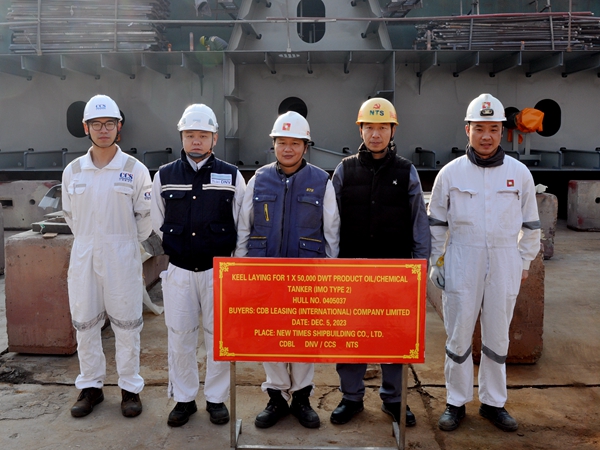 On December 5, 2023, the keel laying of one 50,000 DWT Product Oil/Chemical Tanker (IMO Type 2) with Hull No.0405037 has been carried out successfully by New Times Shipbuilding Co., Ltd. The representatives from the owner CDB Leasing (International) Co., Ltd. and the representatives from the classification societies DNV and CCS attended and witnessed the ceremony together.