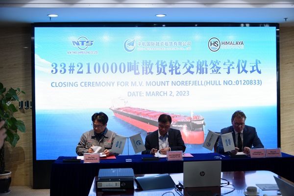 On March 2, 2023, the closing ceremony for 33# 210,000 DWT Bulk Carrier with Hull No.0120833 was held at the meeting room on 8th floor of New Times Office Building. Our CEO Mr. Liu Haijin, Deputy General Manager & Executive Director Mr. Yuan Heng, the representative from the Owner Mr. Olav Eikrem and the representatives from Avic International Leasing Co., Ltd. were present. Mr. Zhang Yuyong Executive Deputy General Manager of New Times Shipbuilding Co., Ltd., Mr. Jan Andersson on behalf of the Owner, Mr. Zhu Jiafeng, Deputy General Manager of Ship Leasing Dept. of Avic International Leasing Co., Ltd. signed the delivery documents. The vessel was smoothly and successfully delivered by us and accepted by the Owner.
