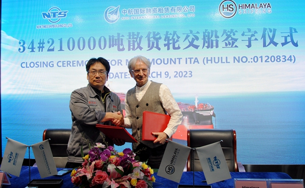 On March 9, 2023, the closing ceremony for 34# 210,000 DWT Bulk Carrier with Builder's Hull No.0120834 was held at the meeting room on 8th floor of New Times Office Building. Our CEO Mr. Liu Haijin, Executive Deputy General Manager Mr. Zhang Yuyong, Deputy General Manager & Executive Director Mr. Yuan Heng and the owner's representative were present. The vessel was smoothly and successfully delivered by us and accepted by the Owner.