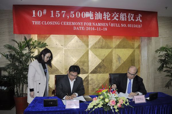 On Nov. 18th, the closing ceremony for No.10 157,500 DWT Oil Tanker was held at the meeting room on 8th floor of New Times Office Building. The delivery documents for this ship were successfully signed by Executive Deputy General Manger Mr. Zhang Yuyong and representatives from the Contracted Buyer, TRF.