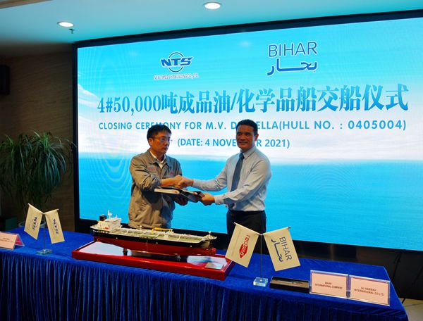 On 4 November 2021, the closing ceremony for 4# 50,000 DWT Product Oil/Chemical Tanker was held at the meeting room on 8th floor of New Times Office Building. Our CEO Mr. Liu Haijin, Executive Deputy General Manager Mr. Zhang Yuyong, VP & Executive Director Mr. Yuan Heng and owner's representative were present, and the members from owner's head office also witnessed this ceremony through video. The vessel was smoothly and successfully delivered by us and accepted by the Owner.
