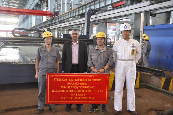 On Sep. 15, along with the presence of our Executive Deputy General Manager Mr. Zhang Yuyong, General Manager Assistant Mr. Ding Baiying and representatives from both the Buyer and Class, one unit of 180,000 DWT Bulk Carrier started construction by the first plate cut in the workshop. Such vessel located the first of those 8 units of the same type ordered by Norwegian owner Frontline. Main particulars are LOA 291.9 m, breadth mld. 45 m, depth mld. 24.75 m, design draft 16.5 m, scantling draft 18.2 m, deadweight 180,000 tons and Class ABS. The first vessel is scheduled to be launched in August, 2015.