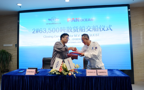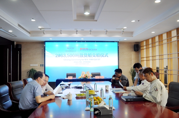 On September 23, 2020, the closing ceremony for 2# 63,500 DWT Bulk Carrier was held at the meeting room on 8th floor of New Times Office Building. Our CEO Mr.Liu Haijin, Executive General Manger Mr. Zhang Yuyong and the representive Mr. Nak Jin Choi from Pan Ocean Co., Ltd. attended this ceremony. The vessel was smoothly and successfully delivered by us and accepted by Pan Ocean.