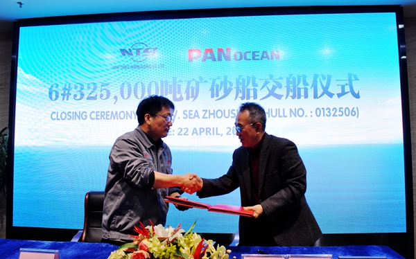 On April 22, 2021, the closing ceremony for 6# 325,000 DWT Ore Carrier was held at the meeting room on 8th floor of New Times Office Building. Our Executive Deputy General Manger Mr. Zhang Yuyong, the representive from Pan Ocean Mr. Nak Jin Choi attended this ceremony. The vessel was smoothly and successfully delivered by us and accepted by Pan Ocean.