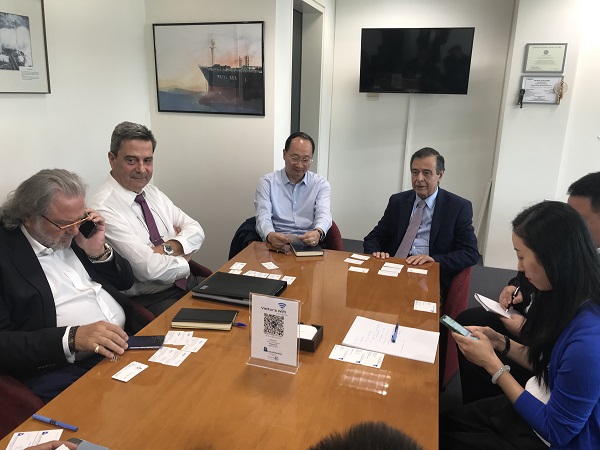 Before and after the dinner reception, they paid visits to many shipping companies or met with them, including Dynacom, Chartworld, Thenamaris, Goldenport, Delta tanker, Ocean bulk, Plembros, Benelux, Monte Nero, Diana Shipping, Metro Star, Avin, Smart Tanker, Estoril, Navitas, Costamare, Danaos, Golden Union, Capital and Minerva. In the one-to-one visit to the above owners, they mainly recommended dual fueled LR2, MR tanker, Suezmax tanker, VLOC and other flagships.