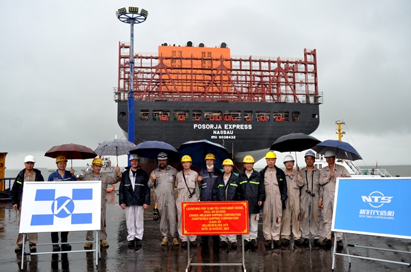 On August 28, 2023, the launching ceremony of one 13,000 TEU Container Vessel bearing builder's hull no.0213002 has been carried out successfully by New Times Shipbuilding Co., Ltd. Our CEO Mr. Liu Haijin, Executive Deputy General Manager Mr. Zhang Yuyong, the representatives from Chartworld NB Manager Mr. Spyros Papandreou and representatives from BV classification society attended and witnessed the ceremony together.