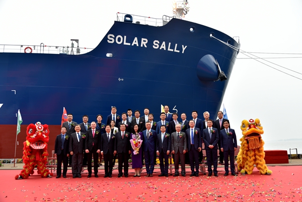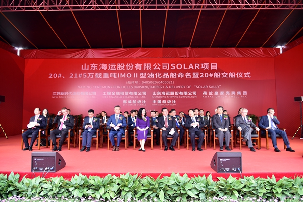 At 4:30 p.m., the naming ceremony of No.20 & No.21 50,000 DWT Product Oil/Chemical Tankers (IMO II Type) and the delivery ceremony of No.20 50,000 DWT Product Oil/Chemical Tanker (IMO II Type) was held ceremoniously. Our Chairman Mr. Yuan Kaifei and Chairman of Shandong Ocean Group Mr. Bao Jianying delivered speeches respectively. Godmother Mrs. Chen Baiwei named the vessel 0405020 and 0405021 for "SOLAR SALLY" and "SOLAR CHERYL" respectively.