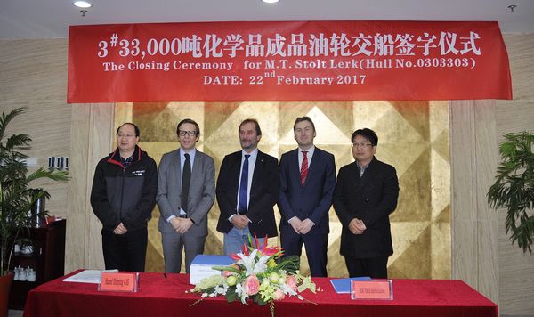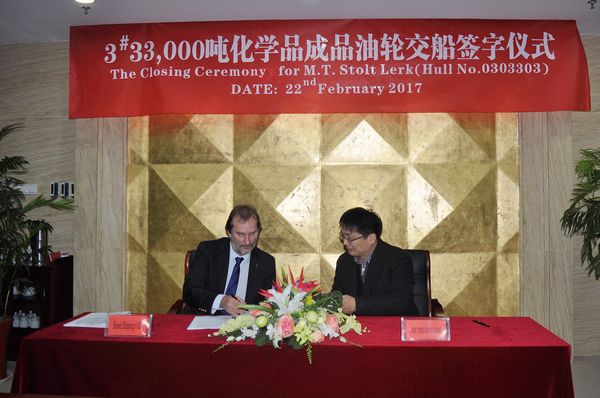 On Feb. 22, the closing ceremony for No.3 33,000 DWT Product Oil and Chemical Tanker was held at the meeting room on 8th floor of New Times Office Building. The delivery documents for this ship were successfully signed by Executive General Manger Mr. Zhang Yuyong and representatives from the Contracted Buyer, Jo Invest AS.