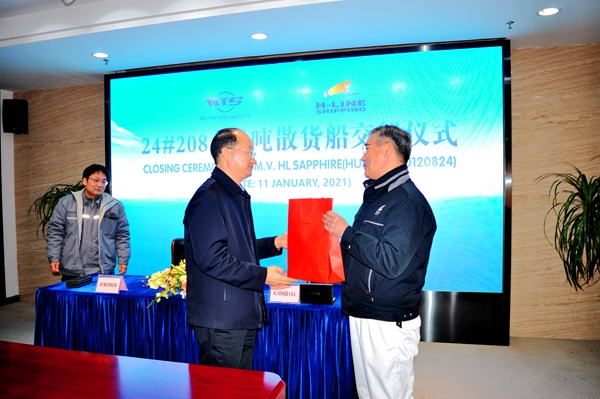 On January 11, 2021, the closing ceremony for 24# 208,000 DWT Bulk Carrier was held at the meeting room on 8th floor of New Times Office Building. Our CEO Mr.Liu Haijin, Executive General Manger Mr. Zhang Yuyong and the representive from H-Line Shipping Co., Ltd. Mr. Young Hwan Lee attended this ceremony. The vessel was smoothly and successfully delivered by us and accepted by H-Line.