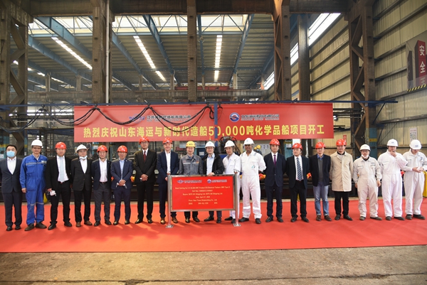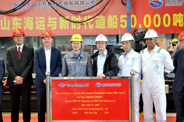 On April 27, 2020, the Steel Cutting Ceremony of No.20 & 21 50,000 DWT Product Oil/Chemical Tankers was carried out successfully by New Times Shipbuilding Co., Ltd. Our CEO Mr. Liu Haijin, Executive General Manger Mr. Zhang Yuyong, representatives from the owner Shandong Shipping Corporation and representatives from the classification societies DNV-GL and CCS attended and witnessed the ceremony together.