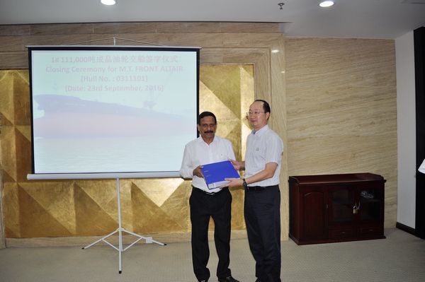 On September 23rd, the delivery ceremony for No.1 111,000 Product/Crude Oil Tanker was successfully held at the meeting room on 8th floor of NTS Office Building, and relevant delivery documents were signed by Executive Deputy General Manger Mr. Zhang Yuyong and representatives from the Contracted Buyer, Frontline.