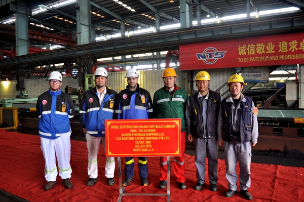 On April 4, 2023, the steel cutting of one 210,000 DWT LNG DUAL FUEL Bulk Carrier bearing builder's hull no.0120849 has been carried out successfully by New Times Shipbuilding Co., Ltd.. Our Manager of Production Dept. Mr. Chen Yuefeng, the representative from EPS Site Manager Mr. Ni Jie and representatives from ABS Classification Society attended and witnessed this event.