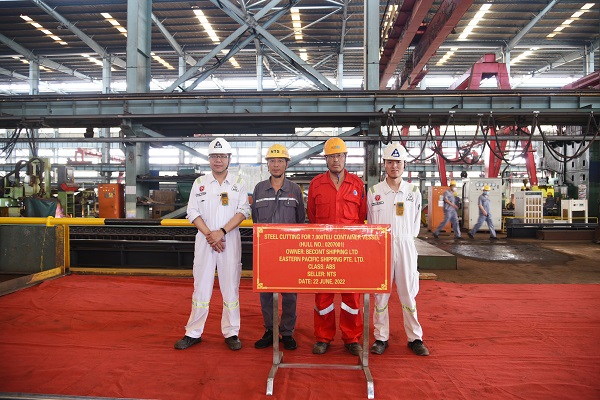 On June 22, 2022, the steel cutting of one 7000TEU Container Vessel bearing builder's hull no.0207001 has been carried out successfully by New Times Shipbuilding Co., Ltd.. Our General Manager Assistant Mr. Xu Zhenyu, the representatives from EPS Site Manager Mr. Ni Jie and representative from ABS Classification Society attended and witnessed this event.