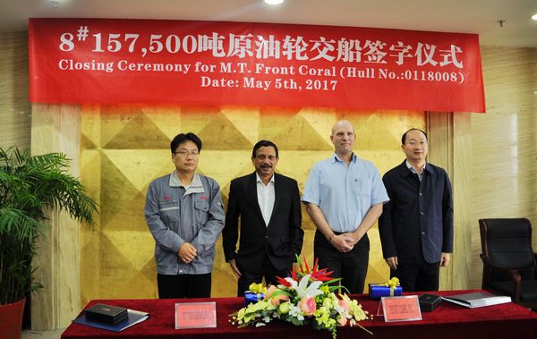 On May 5, the closing ceremony for No.8 157,500 Crude Oil Tanker was held at the meeting room on 8th floor of New Times Office Building.Our CEO Mr. Liu Haijin, Executive General Manger Mr. Zhang Yuyong and representatives from Owner Frontline attended this ceremony. The delivery documents for this ship were successfully signed by both parties.