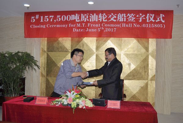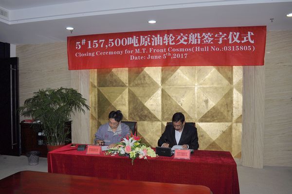 On June 5, the closing ceremony for No.5 157,500 DWT Crude Oil Tanker was held at the meeting room on 8th floor of New Times Office Building. The delivery documents for this ship were successfully signed by Executive General Manger Mr. Zhang Yuyong and representatives from the Contracted Buyer, Frontline.