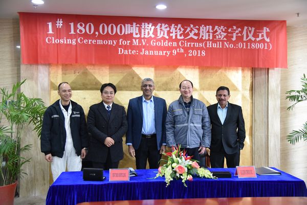 On January 9, 2018, the closing ceremony for No.1 180,000 DWT Bulk Carrier was held at the meeting room on 8th floor of New Times Office Building. Our CEO Mr. Liu Haijin, Executive General Manger Mr. Zhang Yuyong and representatives from Owner Frontline attended this ceremony. The delivery documents for this ship were successfully signed by both parties.