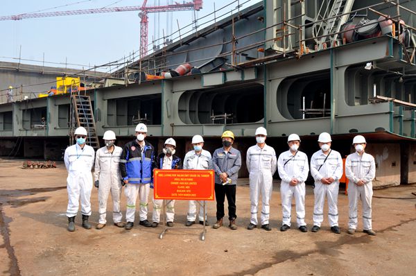 9:28,常務副總經(jīng)理張玉永與希臘船東Seaworld公司代表出席船舶進塢合攏搭載儀式,希臘船東Seaworld公司訂制第2艘56#156500噸油船進塢合攏,該船總長274.3米,型寬48米,型深23.2米,設計吃水16米,結(jié)構(gòu)吃水17.15米,載重156500噸,入ABS船級社。
