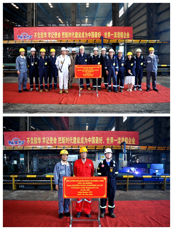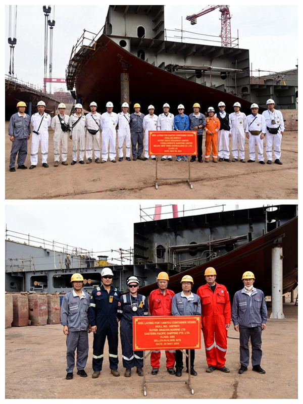 新區(qū)船塢內(nèi),首制8100箱集裝箱船、7#7000箱集裝箱船的進(jìn)塢合攏儀式分別舉行,常務(wù)副總經(jīng)理張玉永分別與船東CONGLOMERATE MARITIME LIMITED代表、船東EPS公司代表及公司相關(guān)部門負(fù)責(zé)人出席活動。船東CONGLOMERATE MARITIME LIMITED在我們企業(yè)訂制了10艘8100箱、10艘11400箱雙燃料動力集裝箱船,此次開工的是8100箱集裝箱船中的首制船,該型船總長260米,型寬45.6米,型深24.7米,設(shè)計吃水12.5米,結(jié)構(gòu)吃水15.5米,空高62.5米,結(jié)構(gòu)吃水下的載重噸97,500MT。船東EPS公司在我們企業(yè)共訂購了7艘7000箱集裝箱船,此次開工建造的是該系列船中最后一艘船舶,該型船總長272.5米,型寬42.8米,型深24.6米,設(shè)計吃水13米,結(jié)構(gòu)吃水15米,載重噸為84,000MT。這兩艘船舶均于2023年11月24日開工建造。