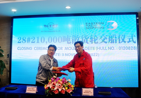 上午10:00,公司在辦公樓八樓會議室舉行28#210000噸雙燃料動力散貨船簽字交付儀式,總經(jīng)理劉海金、常務副總經(jīng)理張玉永與新加坡船東Eastern Pacific Shipping Pte. Ltd.(EPS)代表倪杰出席活動。張玉永與倪杰分別在交船文本上簽字后,28#210000噸雙燃料動力散貨船交付船東運營。新加坡船東Eastern Pacific Shipping Pte. Ltd.(EPS)目前在我們企業(yè)訂制了4艘110000噸油船和11艘210000噸雙燃料動力散貨船和7艘7000箱集裝箱船,此次交付的是210000噸雙燃料動力散貨船系列船中的第2艘船舶。