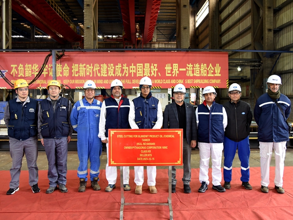 15日上午9:28,新加坡船東Navig8公司訂制的6艘50000噸Ⅱ類化學品船中第4艘船舶——49#50000噸Ⅱ類化學品船點火開工,該型50000噸成品油輪/化學品船總長183.24米,型寬32.2米,型深19.1米,設計吃水11米,結構吃水13.3米,載重50000噸,入KR船級社,船東現(xiàn)場經(jīng)理Kumar、副經(jīng)理Sunil與公司生產(chǎn)管理部等相關部門人出席活動。