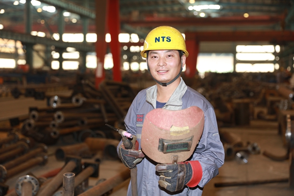 聞炳紅,1997年,職校畢業(yè),2002年進入公司,成為一名焊接學徒工,為早日學有所成,他心無旁騖地跟在師父后面,一招一式地看,一點一滴地學,握焊鉗的手懸麻了,蹲著的腰腿酸了,兩條手臂被飛濺的焊花、滾燙的藥渣灼得傷痕累累,強烈的焊光刺得眼腫淚流,正是這“痛并快樂著”的艱苦訓練和日復一日地觀察琢磨,短短數(shù)月他就基本掌握了一般的焊接技術。俗話說:師父領進門,修行在個人。職校的學習經(jīng)歷以及在機械識圖方面的優(yōu)勢,又讓聞炳紅自信倍增,懷揣著“既懂識圖又會燒焊”的夢想,愛上了焊接這個職業(yè),焊接技藝日益長進。
