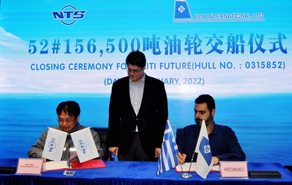 10日上午9:00,常務(wù)副總經(jīng)理張玉永與建信金融租賃公司執(zhí)行總經(jīng)理尹海波先生、銷售總監(jiān)鈕文玨女士共同簽署33#156500噸油船交船文件;下午3:00,張玉永又與希臘船東AVIN INTERNATIONAL LTD代表簽署了52#156500噸油船的交船文本,兩船正式交付船東運營。