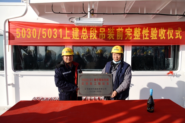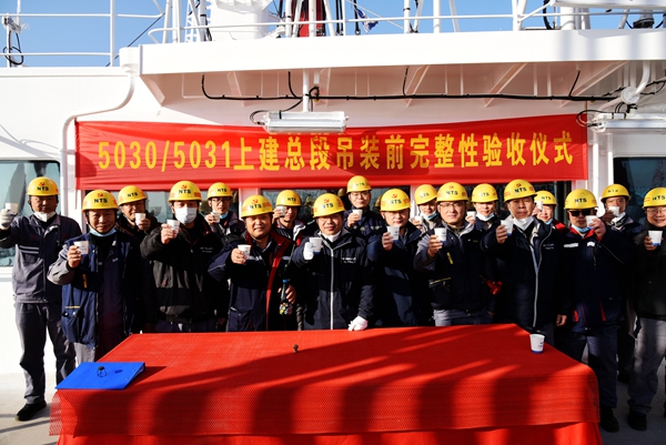 1月8日上午,8時(shí)58分,公司2#船塢區(qū)域,5030/5031上建總段吊裝前完整性驗(yàn)收剪彩儀式隆重舉行,常務(wù)副總經(jīng)理張玉永主持,總經(jīng)理助理徐震宇與居裝部、搭載部、電裝部、涂裝部、運(yùn)輸部、生產(chǎn)管理部、項(xiàng)目組等部門負(fù)責(zé)人一起,共同見證這一榮耀時(shí)刻。