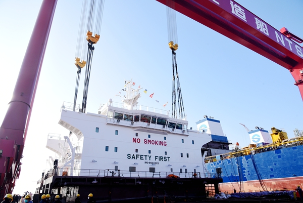 在5030船駕駛室剪彩儀式上,生產(chǎn)管理部部長(zhǎng)陳月峰簽署大節(jié)點(diǎn)完成報(bào)告交給常務(wù)副總經(jīng)理張玉永,搭載部部長(zhǎng)張榮頒發(fā)驗(yàn)收合格牌交居裝部并鳴響汽笛,一時(shí)間,駕駛室外鞭炮齊鳴、禮花繽紛,駕駛室內(nèi)開啟香檳、舉杯同慶、合影留念,9點(diǎn)19分準(zhǔn)時(shí)起鉤吊裝。