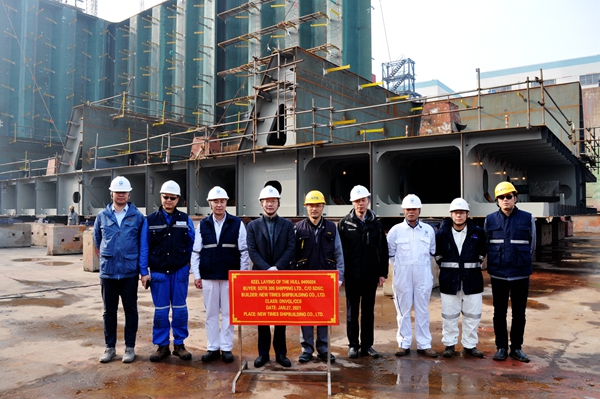 副總經(jīng)理朱韓剛與山東海運代表以及中國船級社和DNV-GL船級社代表等嘉賓共同到現(xiàn)場,點燃鞭炮,噴灑香檳,祝愿船舶建造過程安全且快捷。
