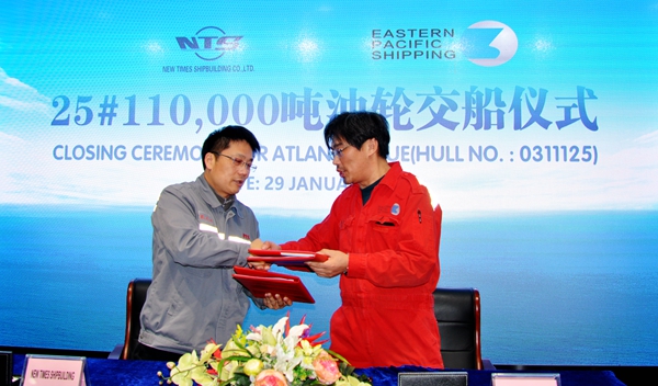 總經(jīng)理劉海金、常務副總經(jīng)理張玉永、董事袁衡與船東新加坡Eastern Pacific Shipping Pte. Ltd.(EPS)公司代表一起出席活動,見證船舶成功交付。25#110000噸油船的成功交付使企業(yè)新年首月實現(xiàn)完工交付船舶5艘,交船總量突破百萬載重噸,達到了106萬載重噸。