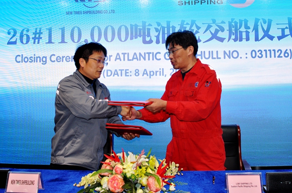 4月8日上午,公司在八樓會議室舉行船舶簽字交付儀式,26#110000噸油船成功交付?偨浝韯⒑=稹⒊崭笨偨浝韽堄裼琅c新加坡船東Eastern Pacific Shipping Pte. Ltd.(EPS)代表現場經理倪杰等嘉賓共同出席儀式,雙方簽署交船文本,見證合作成果達成,并力求在以后工作中取得新突破,續(xù)寫新船項目建造新篇章。