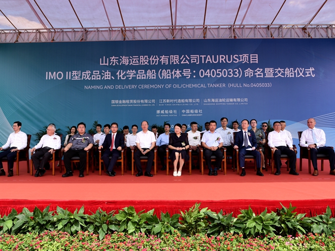 8月15日上午,33#50000噸Ⅱ類化學(xué)品船命名交付儀式在西區(qū)舾裝碼頭隆重舉行,公司總經(jīng)理劉海金、常務(wù)副總經(jīng)理張玉永、副總經(jīng)理袁衡與教母蘇萍、山東海運油輪運輸公司董事長徐濤、國銀金融租賃股份有限公司副總裁黃敏、上海海事大學(xué)副校長李志鵬、中國船級社副總裁范強等嘉賓出席活動。
