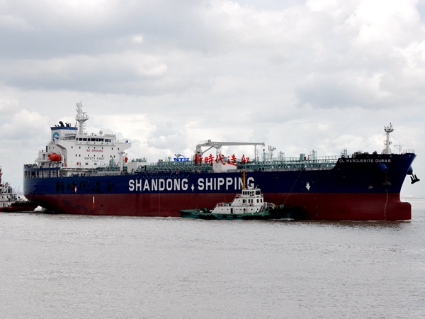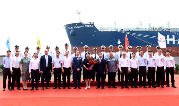 儀式上,國銀金融租賃股份有限公司副總裁黃敏、山東海運油輪運輸公司董事長徐濤、上海海事大學(xué)副校長李志鵬與中國船級社副總裁范強先后表達了與各方精誠合作、產(chǎn)教融結(jié)合助力中國造船、航運及金融業(yè)發(fā)展的美好愿望。在喜慶的氣氛中,教母蘇萍將33#50000噸Ⅱ類化學(xué)品船命名為“CL MARGUERITE DURAS”號,并祝愿新船乘風(fēng)破浪、一帆風(fēng)順。