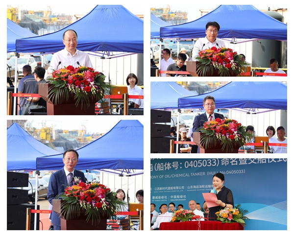 常務(wù)副總經(jīng)理張玉永主持活動。總經(jīng)理劉海金致歡迎辭,他首先對各位嘉賓到來表示熱烈地歡迎,大家的到來為船舶命名交付儀式增添了無限光彩。在船舶建造過程中,山東海運油輪運輸公司團隊、駐廠監(jiān)造團隊、船級社及我們公司全體員工付出了辛勤的勞動與汗水,向大家表示衷心地感謝和崇高的敬意。目前新時代造船己成為國內(nèi)建造MR船型比較多的船廠之一,企業(yè)的產(chǎn)品主要有散貨、箱船、油船、化學(xué)品船四大船型,其中油化船是我們的強項,年產(chǎn)能己達到30艘船舶,當(dāng)前全球減碳需求催生了許多新船訂單,我們也從中獲益,目前企業(yè)訂單任務(wù)己排至2026年底甚至到了2027年,為我們實現(xiàn)“智轉(zhuǎn)數(shù)改”提供了堅強的訂單保證。我們將以此次船舶命名交付為契機,與山東海運油輪運輸公司、國銀金融租賃股份有限公司等諸多老朋友共同攜手締造更多共商共贏、互利互惠的豐碩成果。