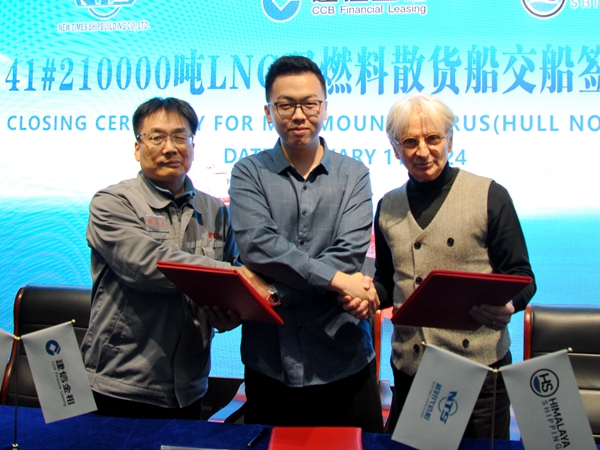 1月11日下午,公司在八樓會議室舉行船舶簽字交付儀式,41#210000噸雙燃料動力散貨船交付船東喜馬拉雅航運公司運營。常務副總經(jīng)理張玉永、船東現(xiàn)場經(jīng)理Davor Radic、建信金租船舶業(yè)務部執(zhí)行總經(jīng)理朱滿華、建信金租風險管理部總經(jīng)理助理楊敏等嘉賓出席活動。