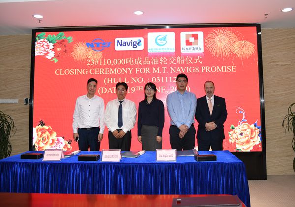 6月18日,公司舉行隆重儀式,為新建船舶23#110000噸油船命名。公司領導劉海金、張玉永、徐震宇、袁衡與船東代表、船級社代表等嘉賓一起出席儀式,共同見證新建成功命名。19日下午,公司常務副總張玉永與該船船東代表共同簽署交船文件,23#110000噸油船正式交付。