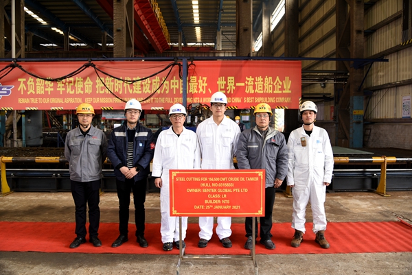 1月25日上午,公司在鋼加車間舉行船舶開工點火儀式,33#、52# 156500噸油船分別點火,正式開工建造。常務(wù)副總經(jīng)理張玉永、副總經(jīng)理朱韓鋼與新加坡船東Sentek Global Pte LTD.、希臘船東Avin International LTD.代表出席活動,見證船舶船體鋼板切割下料。