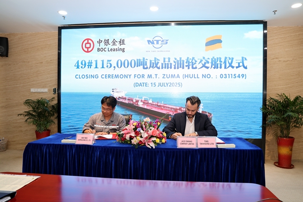 7月14日上午,公司在東區(qū)碼頭隆重舉行船舶命名儀式,49#115000噸油船被命名為“ZUMA”號;15日下午,公司又舉行船舶簽字交付儀式,該船正式交付船東運(yùn)營。