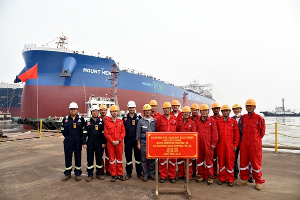 船東EPS公司目前在我們企業(yè)訂有4艘110000噸油船和11艘210000噸雙燃料動力散貨船、7艘7000箱集裝箱船、6艘50000噸化學(xué)品船和2艘155500噸雙燃料油船,此次下水的是210000噸雙燃料動力散貨船系列船中的第9艘船舶;船東喜馬拉雅公司目前在我們企業(yè)訂有12艘210000噸雙燃料動力散貨船,此次下水的也是210000噸雙燃料動力散貨船系列中的第9艘船舶。