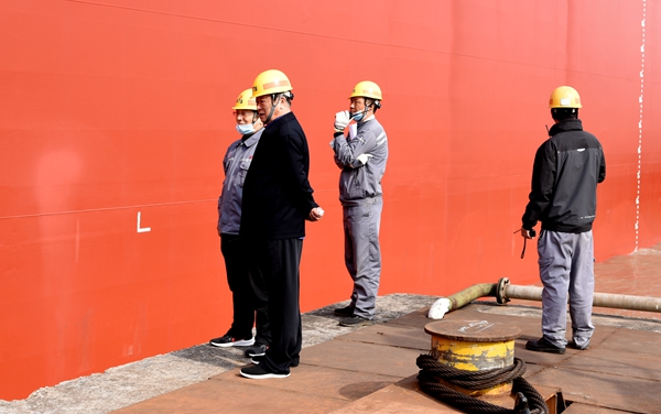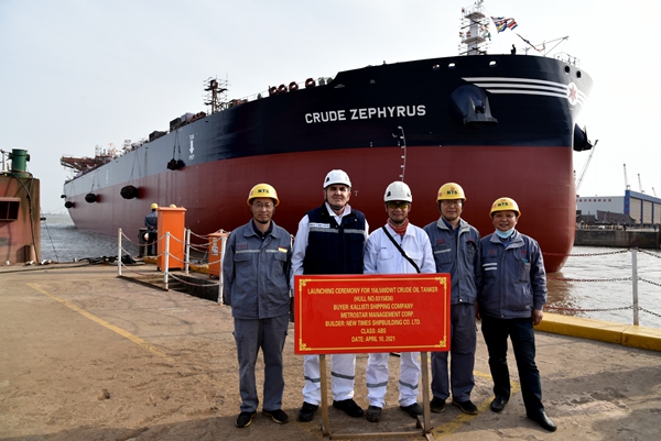 董事長(zhǎng)袁凱飛,常務(wù)副總經(jīng)理張玉永,總經(jīng)理助理丁柏英、徐震宇等公司領(lǐng)導(dǎo)與希臘船東METROSTAR MANAGEMENT CORP.代表、ABS船級(jí)社到現(xiàn)場(chǎng)觀看下水進(jìn)程。