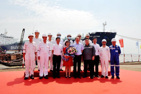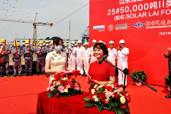 總經(jīng)理劉海金、教母陳文蕾女士、常務(wù)副總經(jīng)理張玉永、副總經(jīng)理袁衡與山東海運代表、船級社代表等嘉賓共同出席活動,見證了船舶命名交付。教母陳文蕾女士將25#50000噸Ⅱ類化學(xué)品船命名為“SOLAR LAI FONG”號,并祝愿她及所有的船員在未來的航行中一帆風(fēng)順,永遠平安!