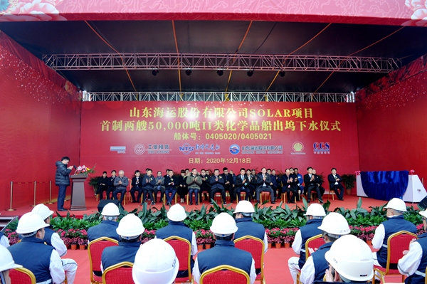 山東海運董事長于冰致辭:新時代造船是國際馳名油化品船舶建造企業(yè),建造技術(shù)進入全球前列,今天首制兩船下水是雙方精誠合作、克服疫情影響取得的重大標(biāo)志性成果。