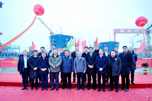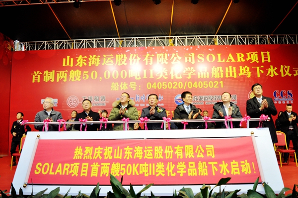 下午4:50,公司董事長袁凱飛、山東海運董事長于冰、靖江市副市長趙建國等嘉賓一起啟動船舶出塢推桿裝置,在鞭炮齊鳴、禮花綻放的熱烈氛圍中,兩艘50000噸化學(xué)品油船相繼緩緩駛出船塢,順利完成下水目標(biāo)。
