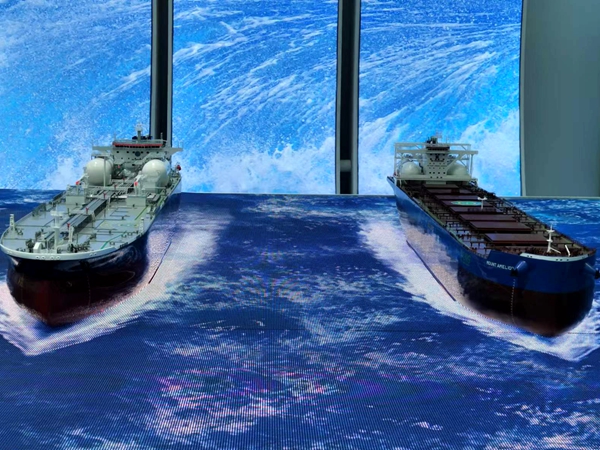 在江蘇館展區(qū),展品既有硬核的工業(yè)產(chǎn)品,也有日常的生活用品,均透露出了濃濃的科技范兒。公司11.1萬(wàn)噸雙燃料動(dòng)力油船模型和21萬(wàn)噸雙燃料動(dòng)力散貨船模型參展,船模置于虛擬海洋桌面,佐以“乘風(fēng)破浪”特效,吸引了不少參觀者駐足流連。