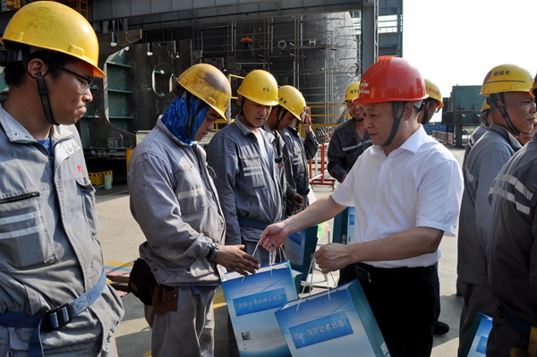 申強(qiáng)等領(lǐng)導(dǎo)在智能車間看望了在高溫下拼搏奮戰(zhàn)的一線員工們,給他們送上防暑降溫的慰問品,感謝大家為靖江經(jīng)濟(jì)建設(shè)作出的巨大貢獻(xiàn)。他指出,新時(shí)代造船有限公司為全市經(jīng)濟(jì)發(fā)展作出了重要貢獻(xiàn),希望大家以更加飽滿的熱情戰(zhàn)高溫、斗酷暑,抓生產(chǎn)、保安全,努力創(chuàng)造新的更大成績。