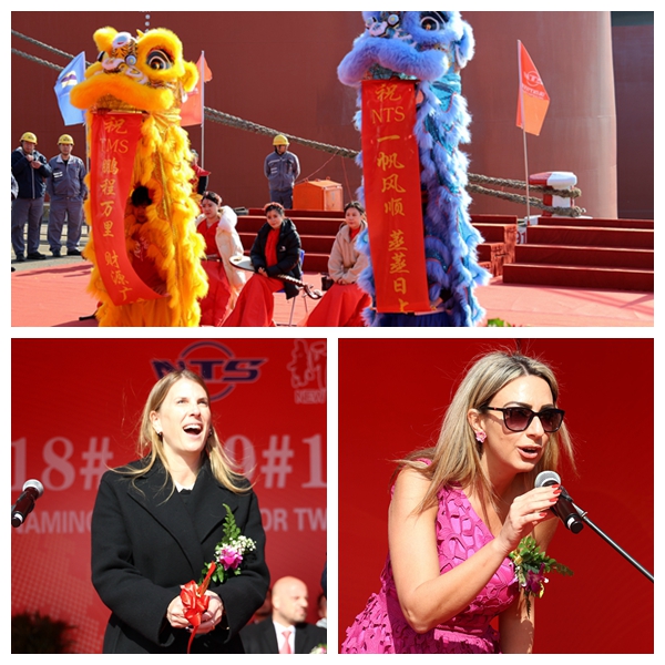 總經(jīng)理劉海金、常務副總經(jīng)張玉永、副總經(jīng)理袁衡與希臘船東TMS代表、教母ALEXANDRA ECONOMOU、教母SOFIA MANOLA、船東船檢代表、船級社代表等嘉賓出席命名儀式。教母ALEXANDRA ECONOMOU、教母SOFIA MANOLA先后為18#19#159000噸原油船命名為“TOSKA”“IPANEMA”號,祝福新船以及隨船船員航行平安,不斷為船東帶來榮譽和財富。
