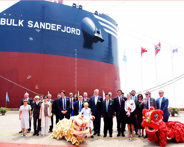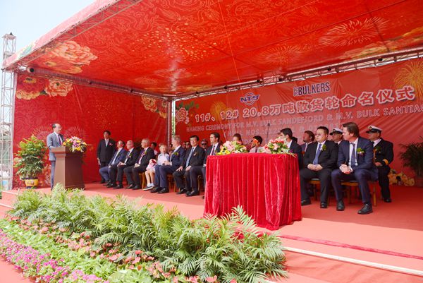 8月7日上午,公司隆重舉行命名儀式,為兩艘208000噸散貨船命名。董事長袁凱飛、總經(jīng)理劉海金、常務(wù)副總經(jīng)理張玉永,公司領(lǐng)導(dǎo)徐震宇、袁衡與挪威船東2020 BULKERS公司代表一起出席活動;顒由,11#、12#208000噸散貨船被命名為“BULK SANDEF JORD”、“BULK SANTIAGO” 號。