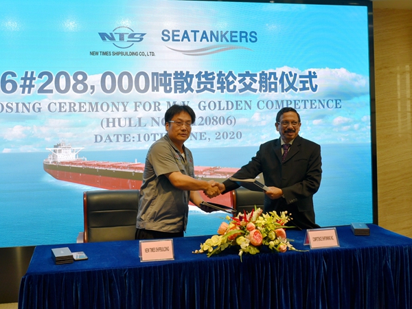6月10日上午,6#208000噸散貨船簽字交船儀式在新時(shí)代辦公樓八樓會(huì)議室舉行,公司總經(jīng)理劉海金、常務(wù)副總經(jīng)理張玉永與挪威船東SEATANKERS公司代表A.C.Caeiro先生等嘉賓一起出席儀式,共同見(jiàn)證交船盛事。該船型總長(zhǎng)299.95米,垂線(xiàn)間長(zhǎng)294.40米,船寬50米,船深24.9米,設(shè)計(jì)吃水16.1米,結(jié)構(gòu)吃水18.4米,載重20.8萬(wàn)噸,入LR船級(jí)社。